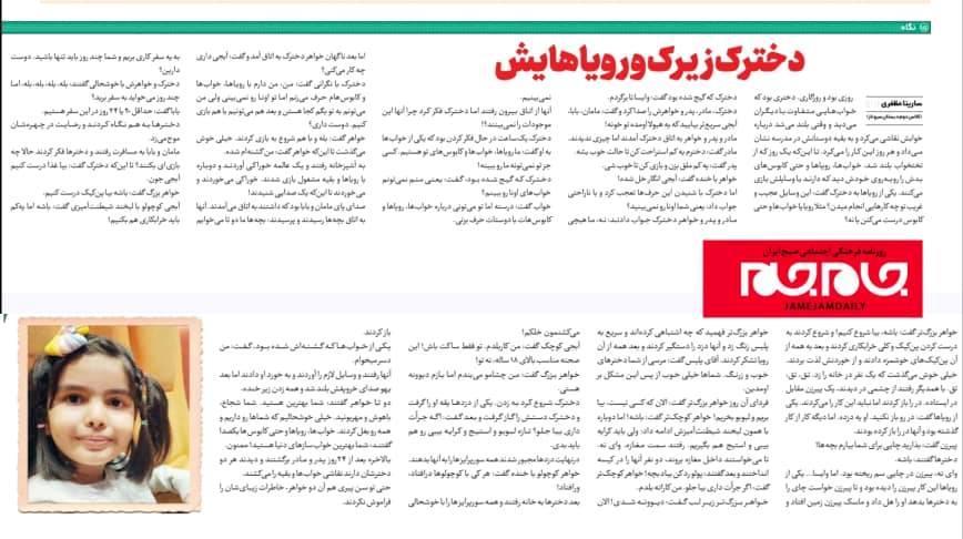 افتخار آفرینی دانش آموز دبستان سروناز در روزنامه جام جم