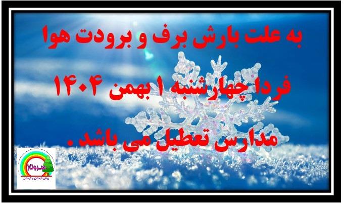 با سلام و احترام .فردا چهارشنبه 1 بهمن 1404 بعلت بارش برف و برودت هوا مدارس تعطیل می باشد .آموزش مجازی هم نیست .آزمون ها نیز به هفته آی...