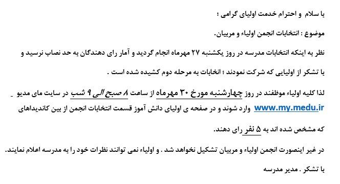خانم بیک محمدی با سلام و احترام خدمت اولیای گرامی ؛ موضوع : انتخابات انجمن اولیاء و مربیان. نظر به اینکه انتخابات مدرسه در روز یکشنبه 27 مهرماه انجام گردید و آمار رای دهندگان به حد نصاب نرسید و با تشکر از اولیایی که شرکت نمودند ؛ انخابات به مرحله دوم کشیده شده است . لذا کلیه اولیاء موظفند در روز چهارشنبه مورخ 30 مهرماه از ساعت 8 صبح الی 9 شب در سایت مای مدیو www.my.medu.ir وارد شوند و در صفحه ی اولیای دانش آموز قسمت انتخابات انجمن از بین کاندیداهای که مشخص شده اند به 5 نفر رای دهند. در غیر اینصورت انجمن اولیاء و مربیان تشکیل نخواهد شد . و اولیاء نمی توانند نظرات خود را به مدرسه اعلام نمایند . با تشکر . مدیر مدرسهدیدگاه ها